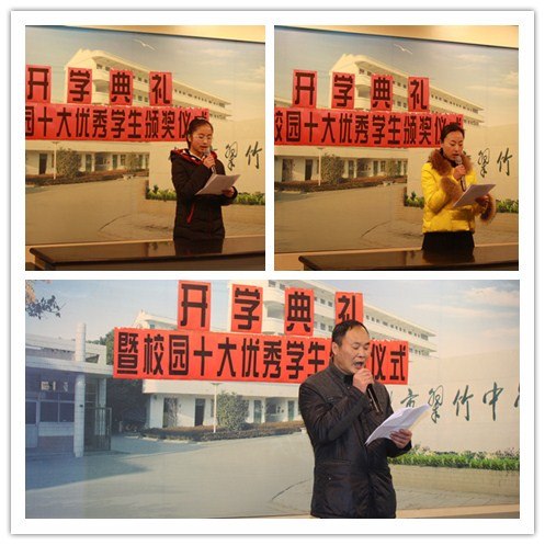2月17日上午,常州市翠竹中学新学期开学典礼在学校演播室主会场举行,典礼由学生会主持,各班级作为分会场在本教室收看同步电视直播。 会议首先公布了2013学年十大优秀学生名单:它们分别是九(3)班陈常欢、九(4)班黄峥、八(4)班陈雨蕾、九(1)班董晟晔、八(6)班梁佳乐、九(1)班金叶、九(5)班章进、七(7)班贺滨冰、七(4)班丁雨婷、九(9)班姚纤纤。主持人分别为他们宣读了颁奖辞,校领导为他们颁发了奖状和证书。此外还对上学期各项先进分别作了表彰,公布了文明班级名单、获得年级十佳称号学生名单、三好学生标兵名单以及各项单项积极分子名单。 成功的花儿,人们只惊羡她现时的明艳!然而当初她的牙儿,浸透了奋斗的泪泉,洒遍了牺牲的血雨。为了让全校学生感受获得先进的奋斗历程,懂得成功并非一蹴而就的道理,学校邀请了十大优秀学生代表七(4)班的陈雨婷同学介绍了经验。会议还邀请了教师代表华莉作了发言,她代表全校教师表达了在新学期中将以全新的姿态认真工作、团结合作、拼搏进取的决心。她还对全校各个年级的学生分别提出了殷切期望。 翠竹中学校长岳亚军致辞,题目是《开发潜能、成就人生》,岳校长用一个有趣的故事,深入浅出的告诉学生,人的潜能是很大的,现在所被开发出来的只是很小的一部分,要善于开发潜能才能获得成功,能不能开发关键在有没有勇气和是否养成良好的习惯。他希望全校学生都能有勇气充分认识到“我能行”,在新学期里取得优秀的成绩,向着成功不断奋进。(莫洪方)